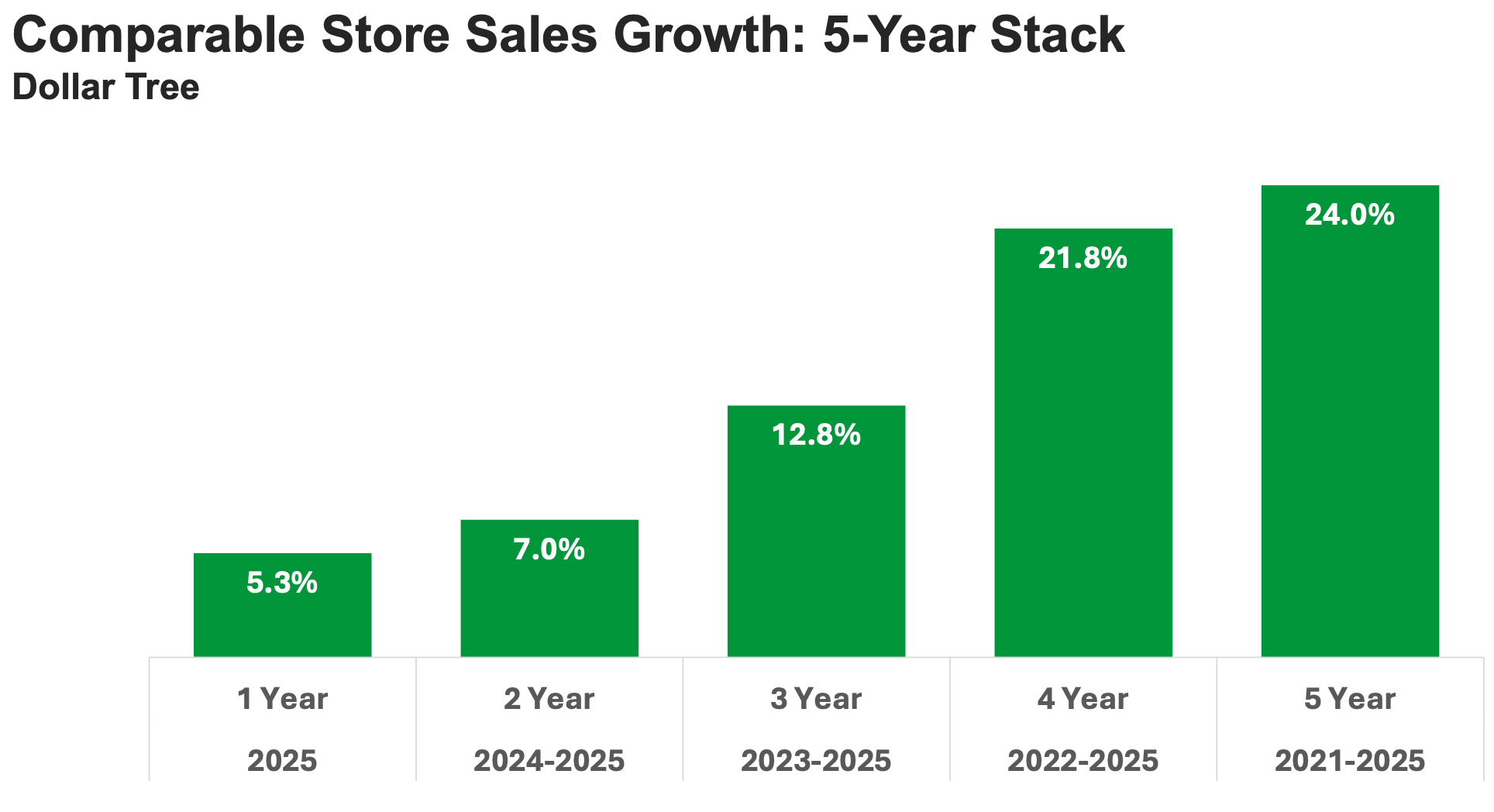 In fiscal 2025, comparable sales rose 5.3%, while a longer-term view shows 24% cumulative comp growth over the past five years, underscoring the durability of demand for value-focused retail.