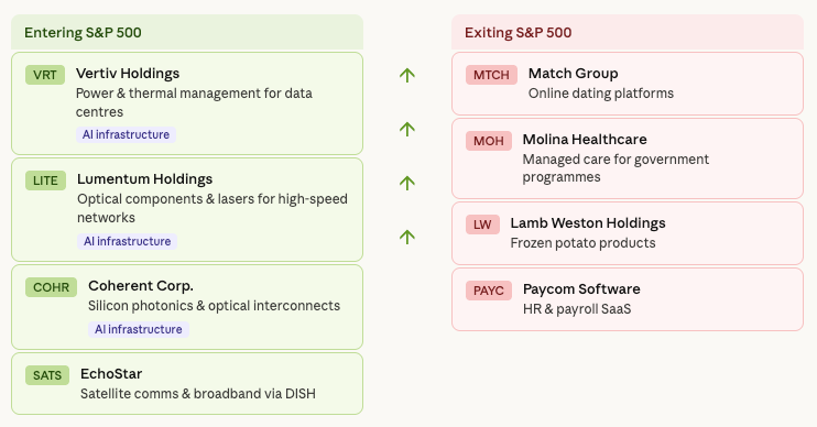 Three AI infrastructure companies and a satellite communications firm are set to join the S&P 500 on 23 March, replacing four companies from sectors that have lost relative market weight.