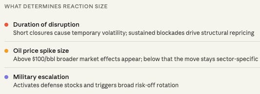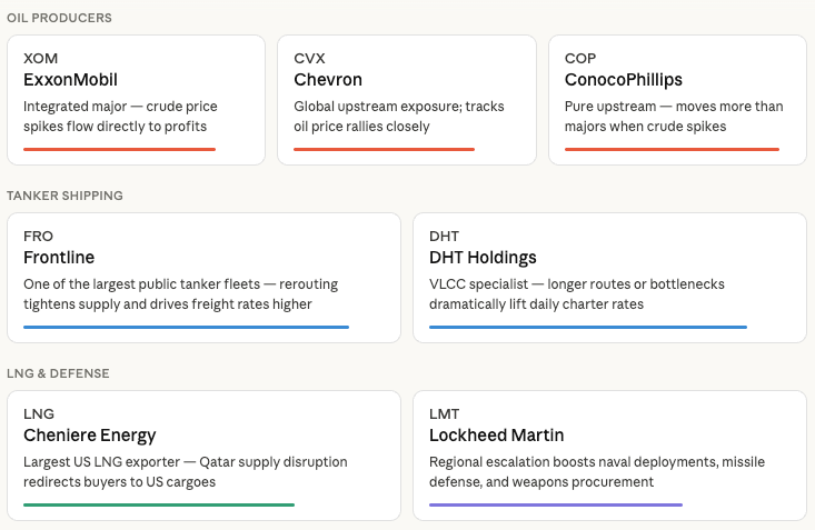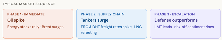 When the Strait of Hormuz is threatened or closed, markets usually react within hours. Historically, the biggest moves occur in oil producers, tanker shipping companies, and defense contractors.