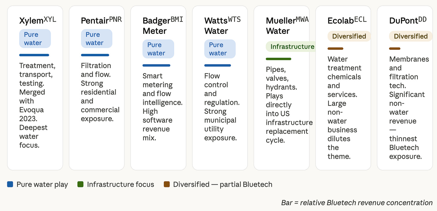 That creates a structural tailwind for Bluetech companies. Unlike utilities, which fund infrastructure upgrades, Bluetech firms sell the equipment and technology needed to solve the problem.