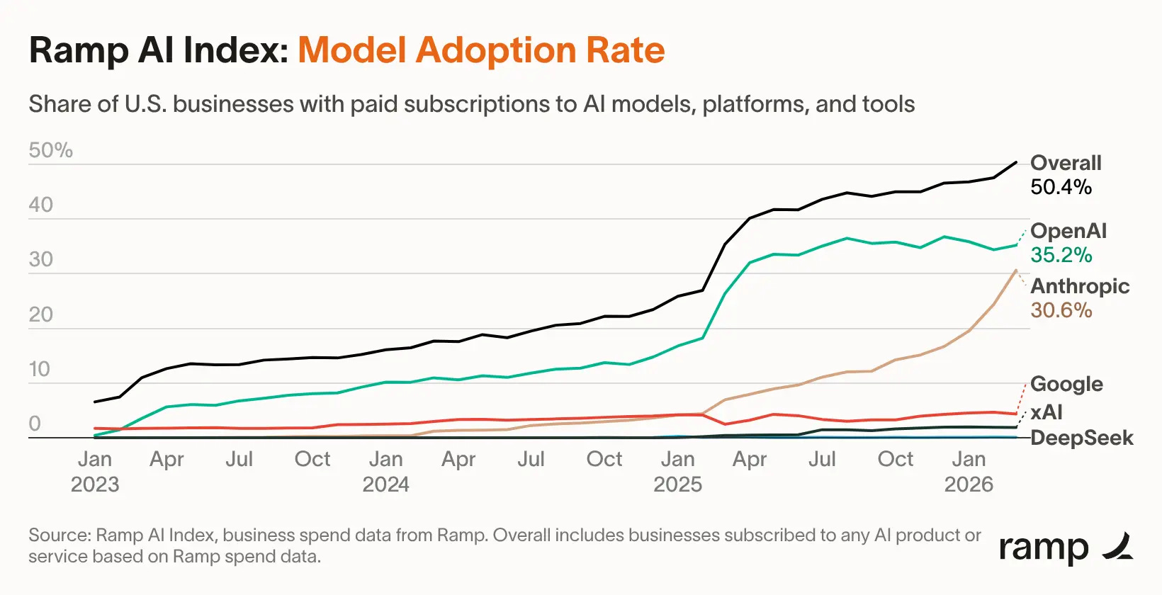 Ramp AI Index shows business AI adoption crossed 50% for the first time in March, up from 35% a year ago. Anthropic adoption has surged since January, despite the Defense Department designating it a security risk.