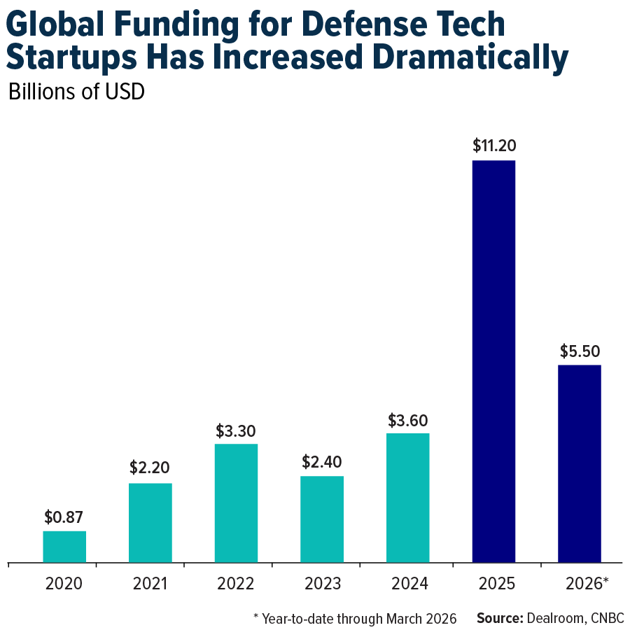 Defense funding is surging, with investment jumping to $11.2B in 2025 and staying elevated into 2026, signaling sustained investor appetite.
