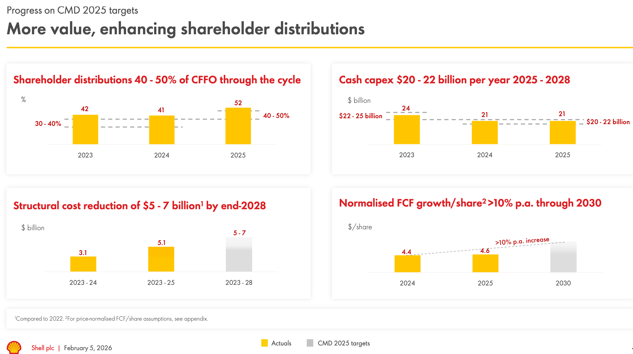 Despite the weaker backdrop, Shell announced a further $3.5 billion share buyback, its 17th consecutive quarter of repurchases above $3 billion, alongside a 4% dividend increase. The group returned 52% of cash flow from operations to shareholders in 2025, above its 40–50% target range, while keeping capex within its $20–22 billion framework and reiterating its goal of more than 10% annual growth in normalised free cash flow per share through 2030.
