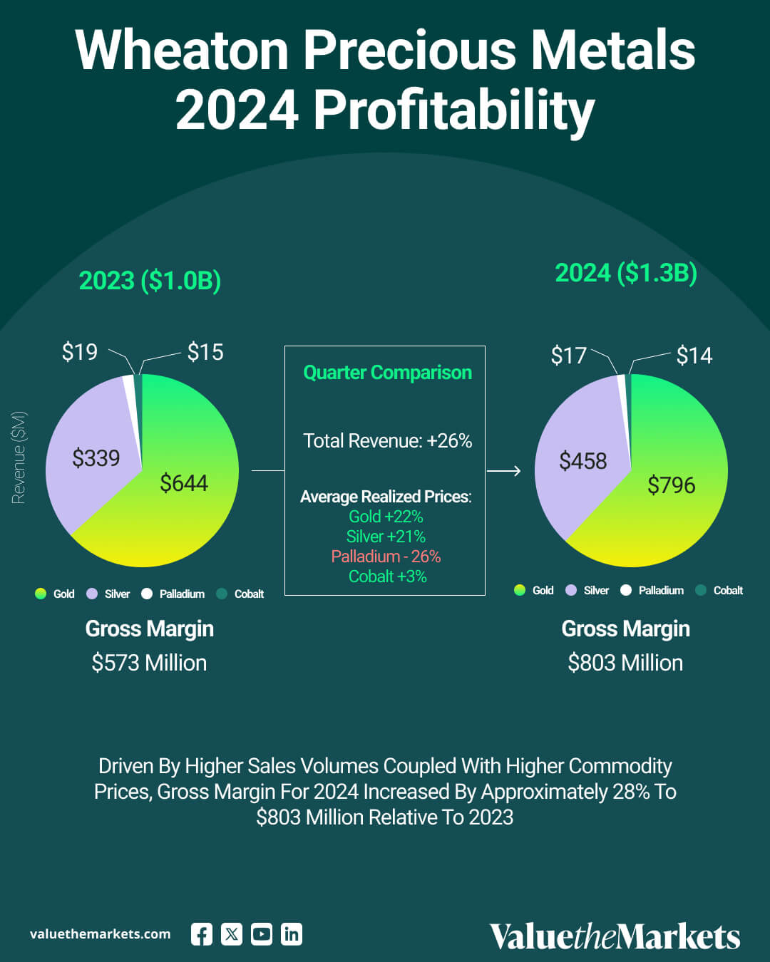 Wheaton Precious Metals Corp (NYSE: WPM) achieved record revenue, adjusted net earnings, and operating cash flows in 2024. The company's gross margin rose by 40% to $247 million during Q4, 2024. However, net earnings were impacted by a $109 million impairment charge returning $88 million. Wheaton's gross margin for 2024 rose by 28% to $803 million, driven by higher sales volumes and increased commodity prices.