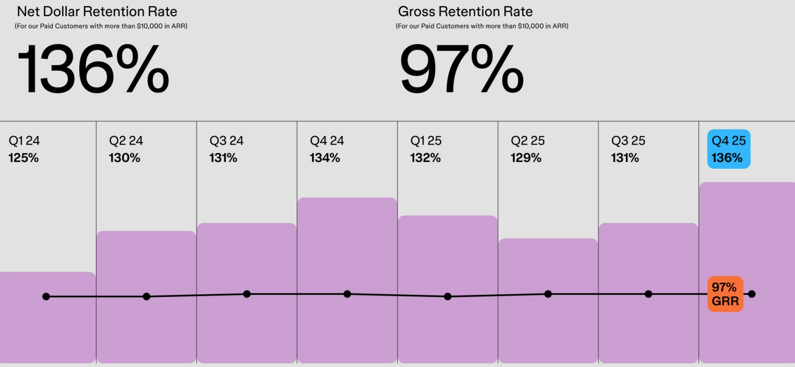 The standout metric is Net Dollar Retention (NDR), shown above. At 136%, it means existing customers are spending 36% more than they were a year ago, a powerful signal of product stickiness and expanding usage. After softening through early 2025, the rebound to a new high suggests Figma’s AI push, particularly Figma Make, is translating into real customer spend.