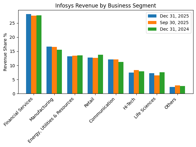 Infosys (NYSE: INFY), a leading Indian IT services company, reported Q3 FY2026 revenue of $5.1 billion, reflecting 3.2% year-over-year growth on a reported basis and 1.7% in constant currency. Net profit dipped 2.2%, while the reported operating margin declined to 18.4%, primarily due to India’s new labor code; however, the adjusted margin excluding this impact stood at 21.2%. Growth was driven by strong performance in the financial services, manufacturing, and communication sectors. The company raised its full-year revenue guidance to 3.0–3.5%, citing robust demand.