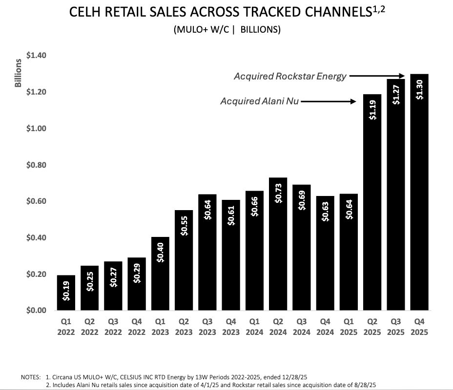 Celsius Holdings posted a decisive Q4 2025 earnings beat, reporting $721.6M in revenue, up ~117% YoY, driven largely by the Alani Nu acquisition, with adjusted EPS of $0.26 well ahead of expectations. The results reflect a clear step-change in scale, as expanded distribution materially lifted the company’s retail footprint and top-line growth. While Alani Nu is the primary driver of current results, the recently closed Rockstar Energy acquisition remains too early to meaningfully impact reported retail sales.