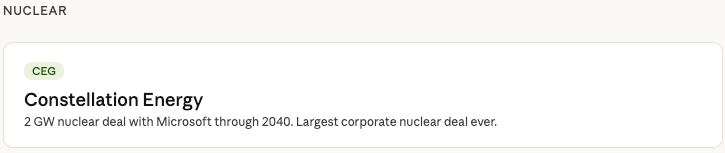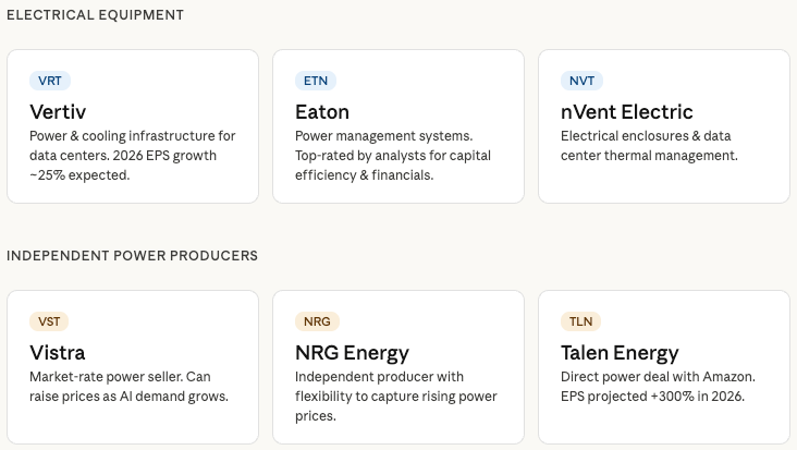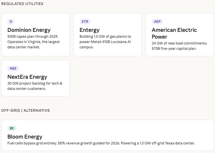 The “off-grid” and independent power producer plays (BE, VST, TLN) are the most directly tied to the bottleneck itself, since regulated utilities earn fixed returns regardless of price spikes. Some of this AI power narrative may already be priced in for certain names after strong 2025 runs.