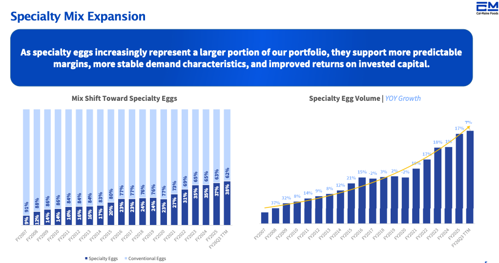 Cal-Maine Foods, Inc. reported a 53.0% drop in quarterly net sales to $667.0 million, driven by sharply lower egg prices. Net income fell 90.1% year over year, underscoring how quickly prior pricing tailwinds have reversed. The results highlight the volatility of commodity-linked earnings and the company’s push to stabilize its mix. However, Cal-Maine’s growing specialty egg volumes and rising mix highlight a strategic shift toward more stable, higher-value products.