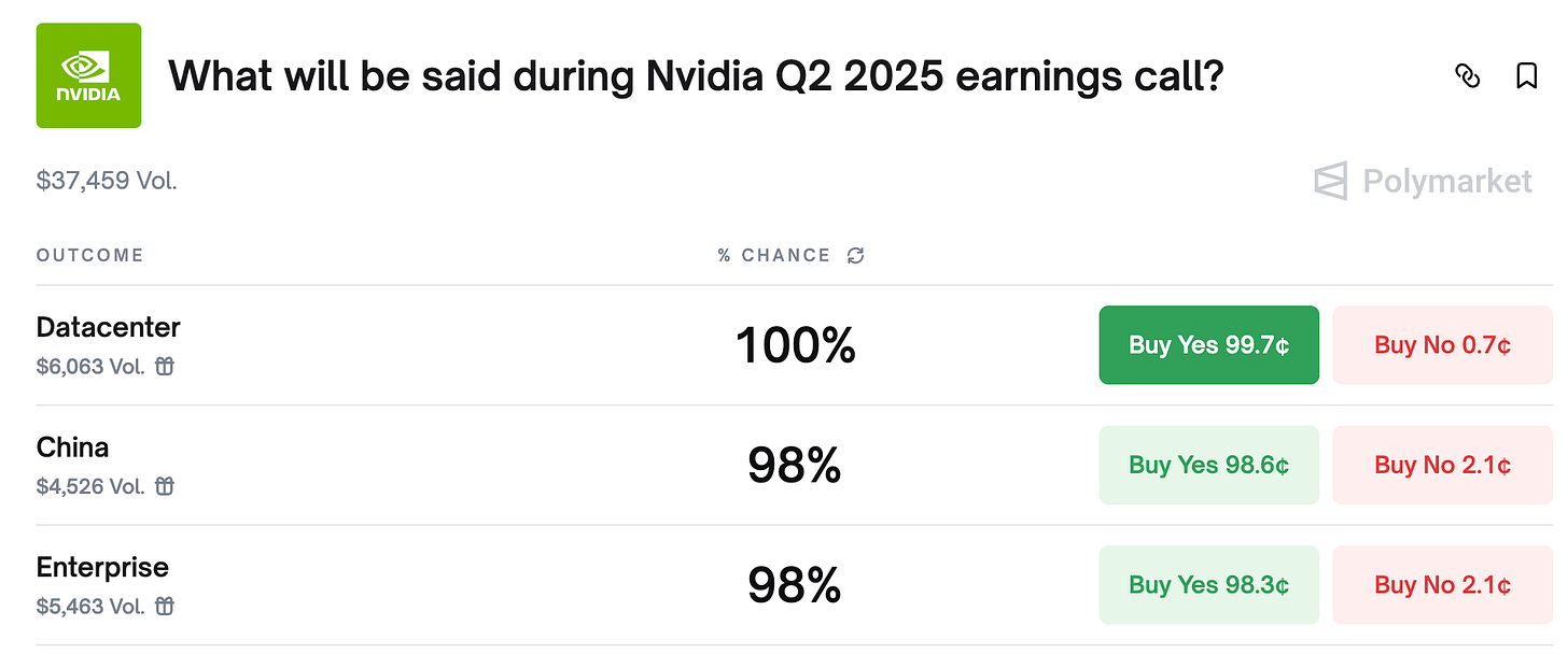 All eyes on Nvidia this week as Q2 earnings land Wednesday, August 27, 2025, right after the market close. On Polymarket, traders are betting on which buzzwords will pop up in the call. Simultaneously, Nvidia is grappling with regulatory headwinds in China, halting H20 chip production and fast‑tracking a new AI chip.