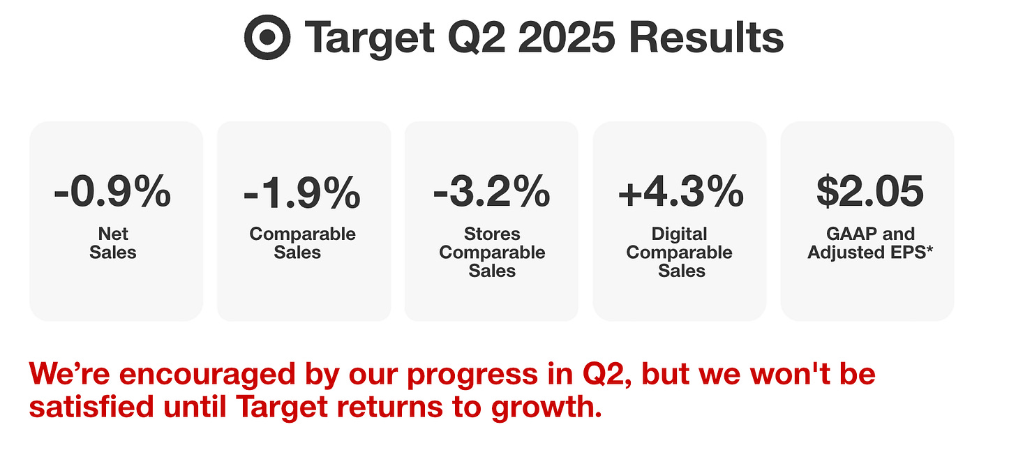 Target’s Q2 2025 GAAP and adjusted EPS came in at $2.05, slightly above expectations, with net sales of about $25.2 billion, a 0.9 % year-over-year decline. Comparable-store sales fell around -1.9 %, while digital comparable sales rose ~4.3 %. Despite beating on EPS, margins shrank and the stock dropped sharply on investor concerns (roughly 6–10%), though full-year guidance remains intact at GAAP EPS of $8-$10 and low-single-digit sales pullback.