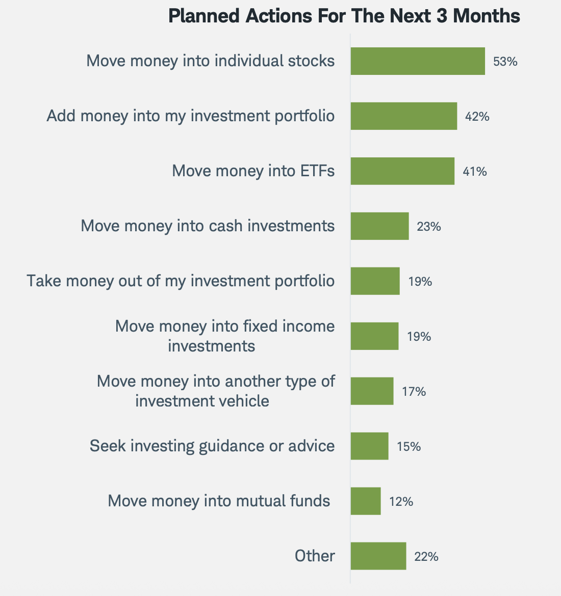 53% of traders plan to pile into individual stocks, more than ETFs, cash, or mutual funds, in the next 3 months, per Schwab’s latest survey.