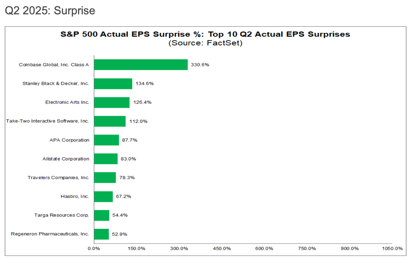 In Q2 2025, Coinbase had the biggest earnings surprise in the S&P 500, beating expectations by 330.6%. Other top surprises came from Stanley Black & Decker (134.6%), Electronic Arts (126.4%), and Take-Two Interactive (112%). The rest of the top 10, including APA, Allstate, Travelers, Hasbro, Targa Resources, and Regeneron, posted surprises ranging from 87.7% down to 52.9%.